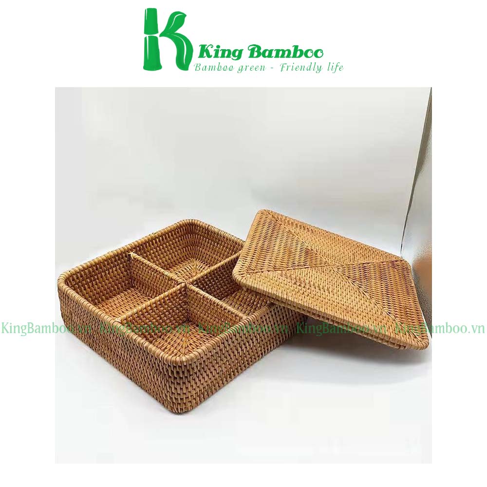 Khay đựng đồ ăn, hoa quả vuông 4 ngăn decor mây tre đan KING BAMBOO