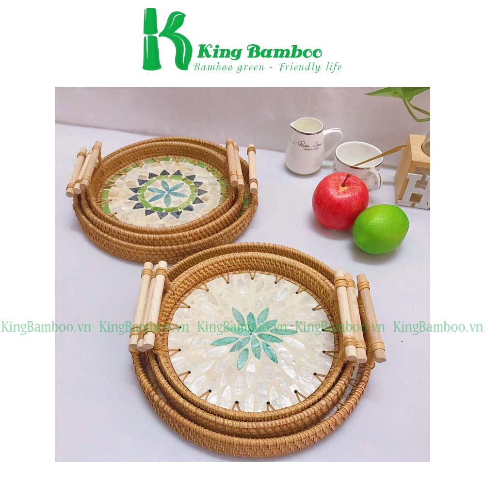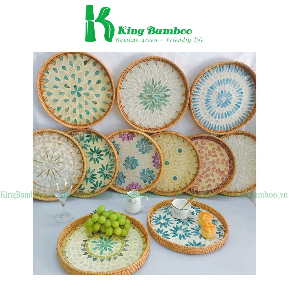 Khay mây khảm trai tròn bày hoa quả đồ ăn, mây tre đan KING BAMBOO
