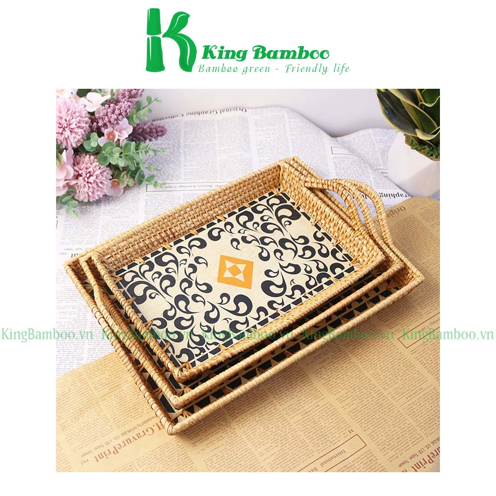 Khay mây đáy gỗ họa tiết hoa, mây tre đan KING BAMBOO